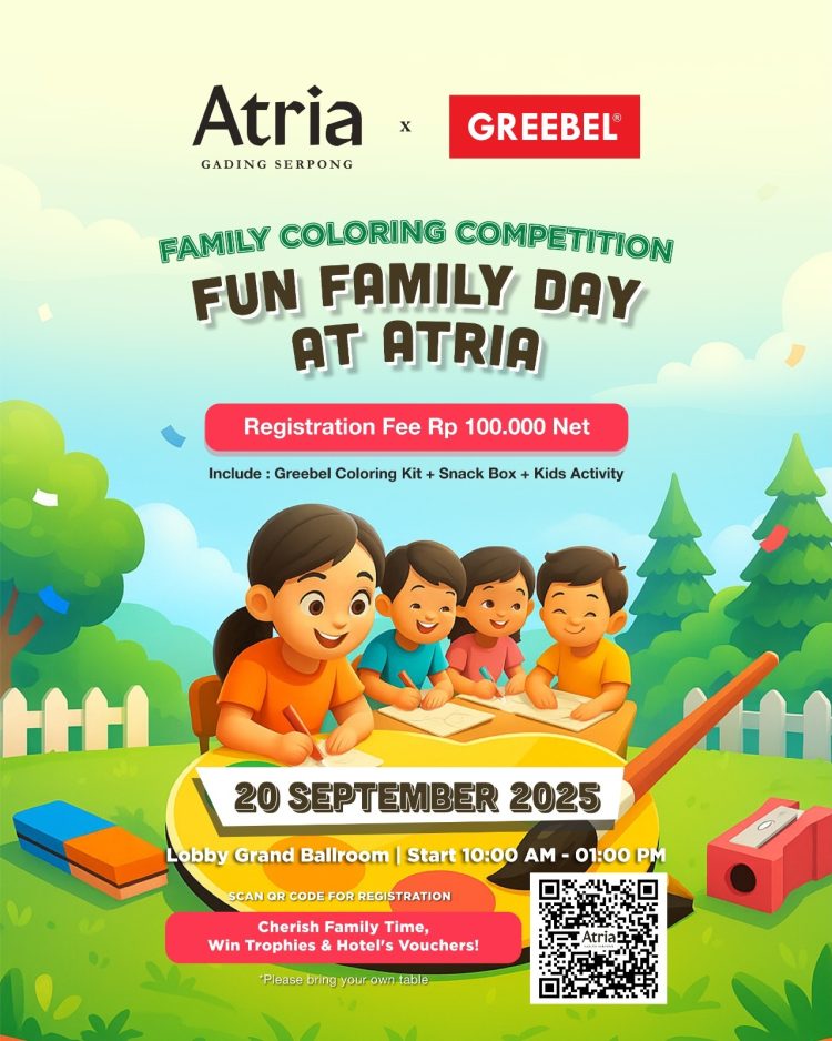 TANGERANG, WT – Untuk mempererat hubungan orang tua dan anak, Atria Hotel & Residences Gading Serpong menggandeng Greebel untuk menyelenggarakan Family Coloring Competition. Acara ini dijadwalkan pada Sabtu, 20 September 2025, dengan tema “Fun Family Day at Atria”, bertempat di Lobby Grand Ballroom Atria Hotel Gading Serpong.