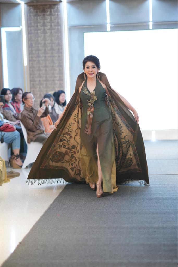 “Corak batik yang telah digunting ini tidak hanya menjadi bagian dari gaun, tetapi juga diaplikasikan sebagai aksesori, seperti kalung atau corsage, menambah keanggunan dan kedalaman pada setiap rancangan,” kata Agnes.