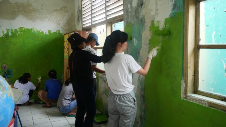 Rehabilitasi sejumlah dinding ruang kelas sekaligus perbaikan beberapa area bangunan yang telah mengalami kerusakan dengan menurunkan puluhan tenaga karyawan Siloam Hospitals.