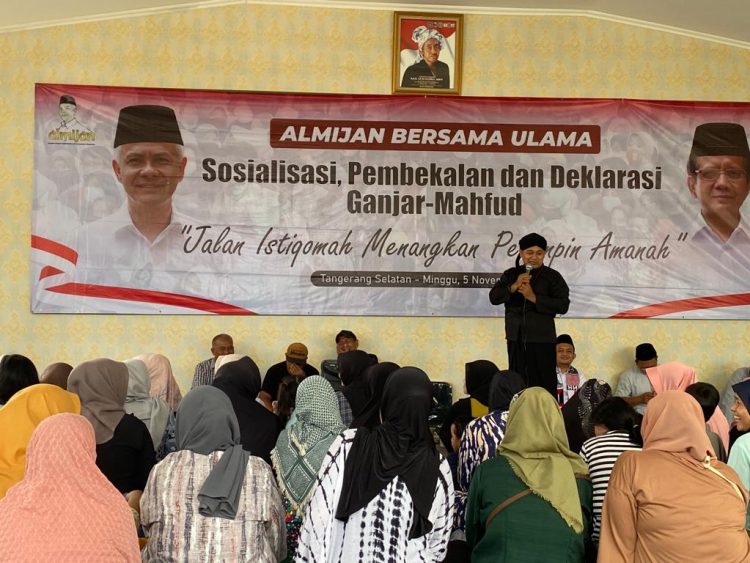 Relawan Aliansi Muslim Indonesia untuk Ganjar Pranowo (Almijan) menggelar Sosialisasi, Pembekalan dan Deklarasi Pendukung Calon Presiden dan Wakil Presiden Ganjar Pranowo-Mahfud MD di Majelis Pengajian Sholawat Nariyah (Pesona) komplek Pesantren Kun Fayakun, Pondok Aren, Kota Tangerang Selatan Provinsi Banten, Minggu (5/11/2023).