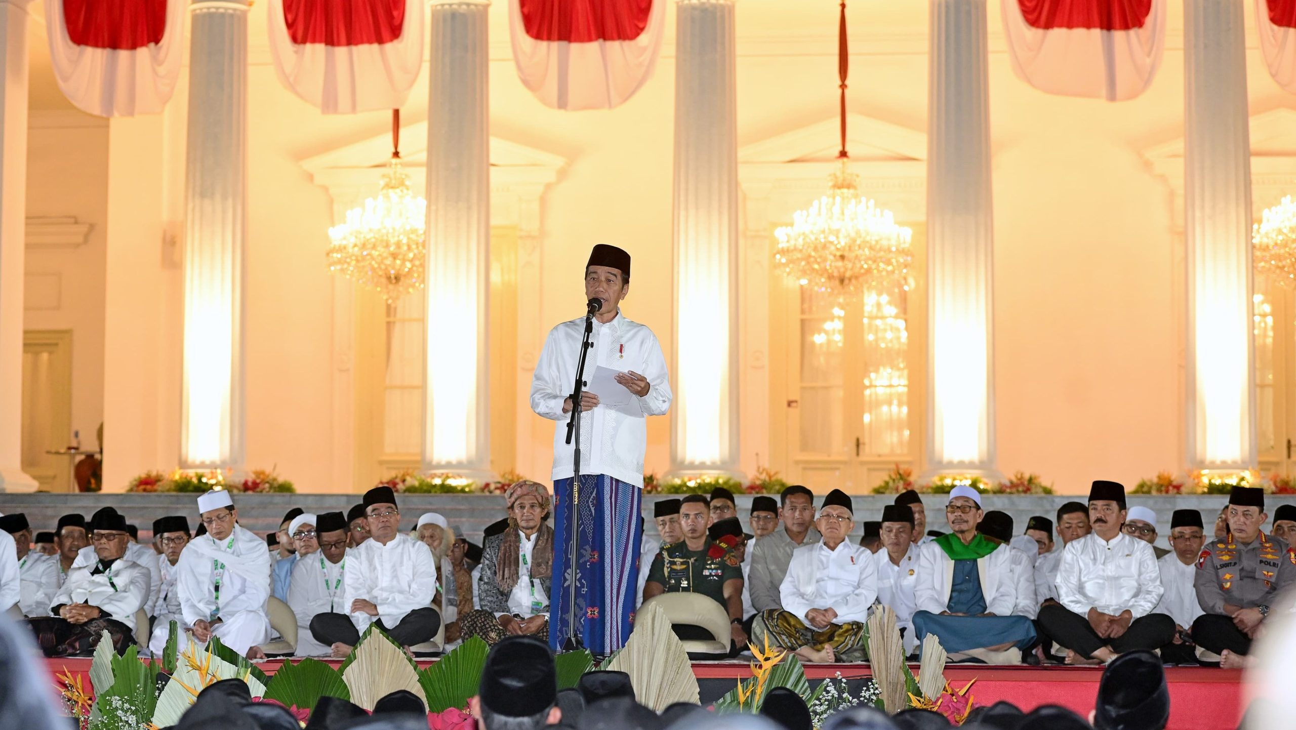 Presiden Joko Widodo beserta Ibu Iriana Joko Widodo menghadiri acara zikir dan doa kebangsaan di halaman Istana Merdeka, Jakarta, pada Kamis, 1 Agustus 2024. Acara tersebut merupakan bagian dari rangkaian kegiatan peringatan Hari Ulang Tahun (HUT) ke-79 Kemerdekaan Republik Indonesia.