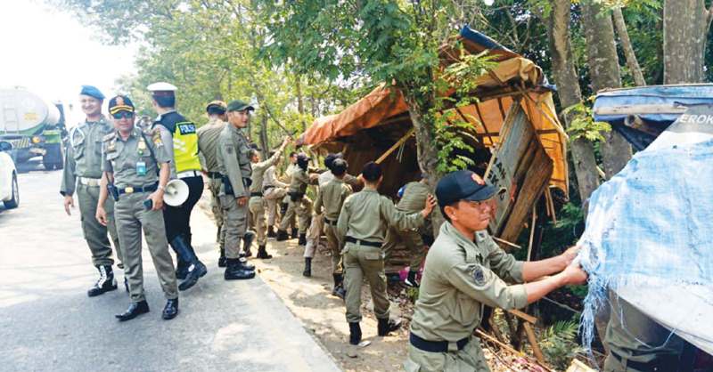 “Dalam Perda Nomor 10 Tahun 2010 Pasal 29 telah diterangkan bahwa dilarang untuk mendirikan bangunan kios di pinggir jalan, badan jalan dan bahu jalan dan tempat umum. Ini jelas melanggar dan kita selaku penegak perda harus menertibkannya,” katanya kepada wartawan melalui sambungan telepon seluler.