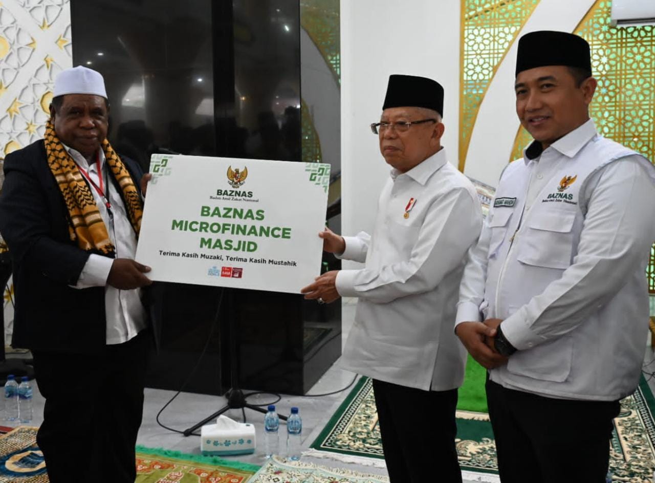 PAPUA BARAT, WT – Wakil Presiden (Wapres) KH Ma`ruf Amin bersama Badan Amil Zakat Nasional (BAZNAS) RI menyerahkan program bantuan BAZNASe Microfinance Masjid untuk 33 mustahik di Kabupaten Fakfak, Papua Barat, Jumat (14/7/2023).