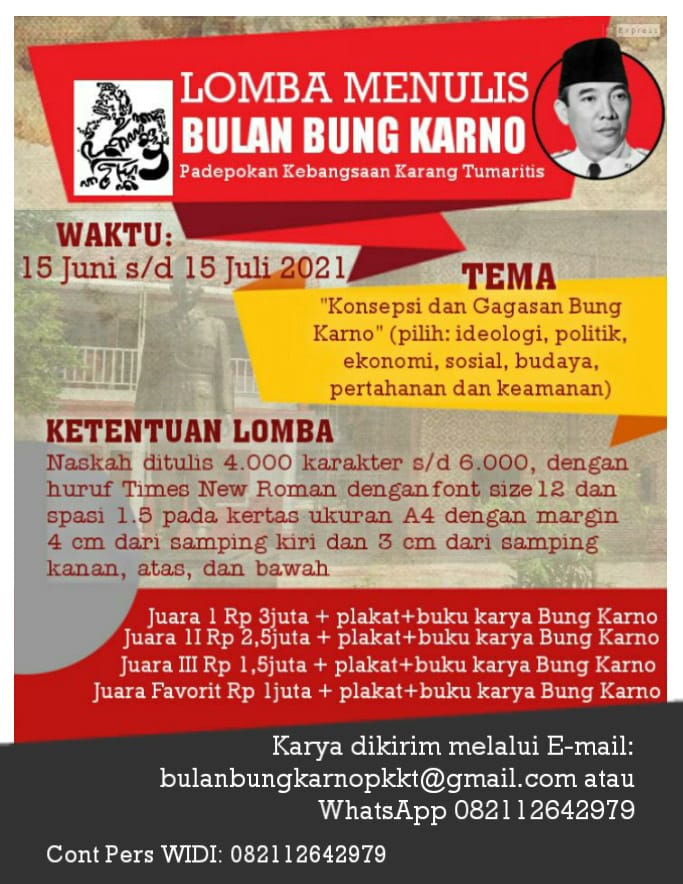 Untuk diketahui, lomba menulis dalam rangka Bulan Bung Karno ini dimulai dari 15 Juni hingga 15 Juli 2021. Peserta bolah dari kalangan masyarakat umum, seniman, pelajar, mahasiswa, termasuk Jurnalis. Peserta wajib mengirimkan karya dengan tulisan sebanyak 4.000 sampai dengan 6.000 karakter ke alamat E-mail: lombabulanbungkarnopkkt@gmail.com. (RIK)
