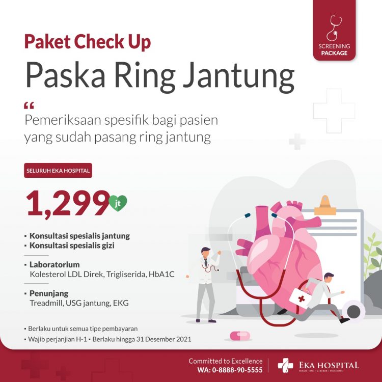 Ditambahkan Head of Marketing Corporate Eka Hospital, Erwin Suyanto, Eka Hospital meluncurkan Paket Post PCI Jantung untuk memberikan pemeriksaan lengkap, baik dari sisi konsultasi spesialis jantung maupun konsultasi spesialis gizi. Paket yang ditawarkan seharga Rp 1.299.000 ini juga dilengkapi dengan pemeriksaan laboratorium serta penunjang lainnya seperti treadmill, ekokardiografi (USG) jantung dan elektrokardiogram (EKG) jantung. Paket ini tersedia di seluruh jaringan Eka Hospital Group: BSD, Bekasi, Cibubur, dan Pekanbaru dengan melakukan pendaftaran pada H-1 di nomor WhatsApp 0-8888-90-5555.