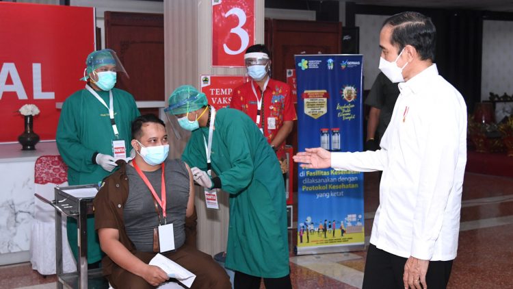 Setelah meninjau vaksinasi massal bagi para ulama, tokoh lintas agama, dan santri di Masjid Agung Jawa Tengah, Presiden Joko Widodo melanjutkan agenda kunjungan kerja di Provinsi Jawa Tengah dengan meninjau vaksinasi massal bagi para pelayan publik. Kali ini, kegiatan vaksinasi dipusatkan di Gedung Gradhika Bhakti Praja, Kompleks Kantor Gubernur Jawa Tengah, Kota Semarang, Rabu, 10 Maret 2021. Setibanya tiba di lokasi vaksinasi sekitar pukul 14.10 WIB, Presiden langsung meninjau jalannya vaksinasi yang tengah berjalan. Sejumlah peserta tampak duduk rapi mengantre ketika Presiden menyapa dan berinteraksi dengan mereka. Para peserta yang hadir tampak antusias mengikuti vaksinasi ini dengan tetap menerapkan protokol kesehatan yang ketat. Mereka juga mengikuti seluruh tahapan vaksinasi mulai dari validasi data, penapisan kesehatan, penyuntikkan, hingga observasi pascaimunisasi. Dalam kesempatan ini, vaksinasi ditujukan bagi 1.386 sasaran yang terdiri atas aparatur sipil negara (ASN), dokter, pegawai BUMN, pegawai BUMD, pejabat pemerintah, hingga wartawan di Jawa Tengah. Untuk mengantisipasi banyaknya peserta, vaksinasi digelar di lantai 1 dan lantai 2 Gedung Gradhika Bhakti Praja.