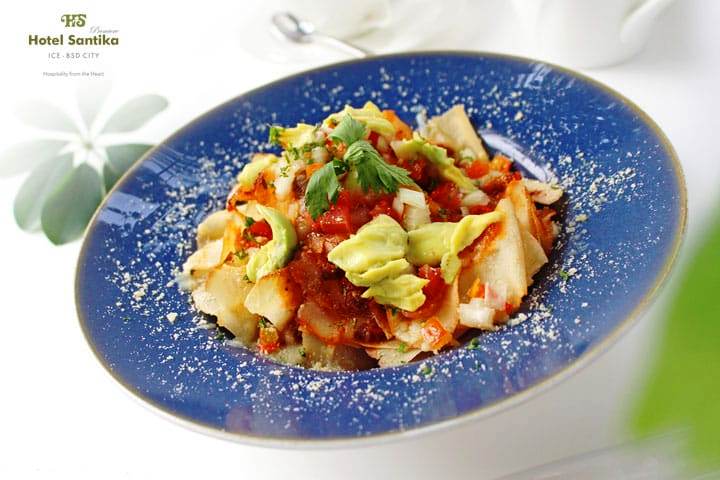 “Kami menghadirkan camilan Internasional yang dipadukan dengan kuliner lokal. Nachos yang aslinya terbuat dari tortilla namun Cassava Nachos ini kami ganti menggunakan cassava chips atau keripik singkong yang memiliki tekstur lebih ringan dan garing, sehingga tidak mudah untuk berhenti mencicipinya”, ujar Public Relation Hotel Santika Premiere ICE-BSD City, Devy Kurnia.
