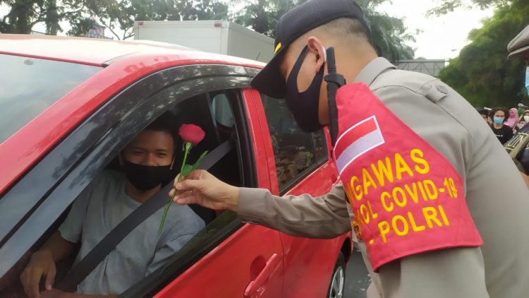 Pemberian masker dan bunga mawar dipimpin langsung oleh Kapolsek Serpong, AKP Supriyanto dan disambut baik oleh sejumlah pengendara.