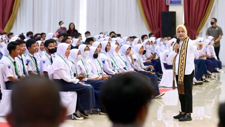 Ibu Iriana Joko Widodo dan para anggota OASE KIM meninjau sosialisasi “Generasi Muda Emas, Bebas Narkoba, dan Peduli Lingkungan” yang diselenggarakan di Gedung Bagas Raya, Kota Bandar Lampung, pada Rabu, 8 Maret 2023. Kegiatan tersebut diikuti oleh pelajar sekolah menengah atas (SMA) dan sekolah menengah kejuruan (SMK) di Provinsi Lampung.