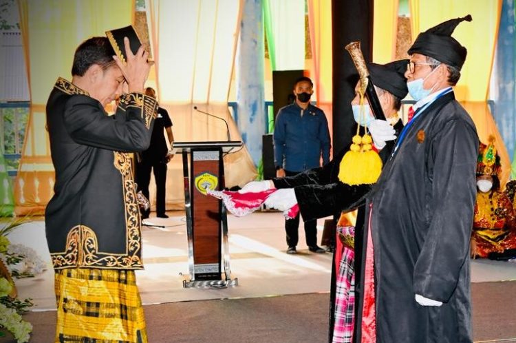 “Saya ingin menyampaikan ucapan terima kasih yang sebesar-sebesarnya kepada Yang Mulia Sultan Buton Bapak La Ode Muhammad Izat Manarfa beserta seluruh jajaran lembaga adat Kesultanan Buton yang telah memberikan anugerah gelar kepada saya yaitu La Ode Muhammad Lakina Bhawaangi yi Nusantara,” tutur Presiden.