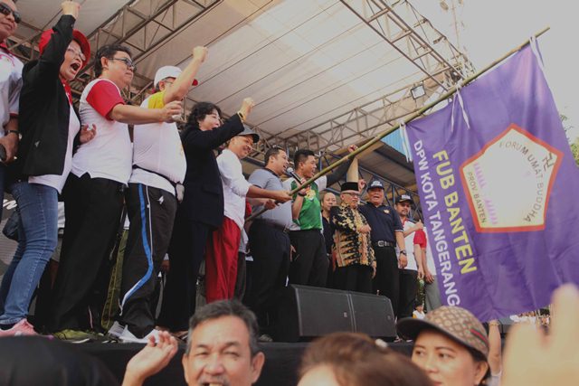TANGERANG- Walikota Arief R Wismansyah menghadiri gerak jalan sehat kebangsaan dalam rangka memperingati hari Tri Suci Waisak yang diinisiasi Forum Umat Budha Banten di alun – alun Kota Tangerang.