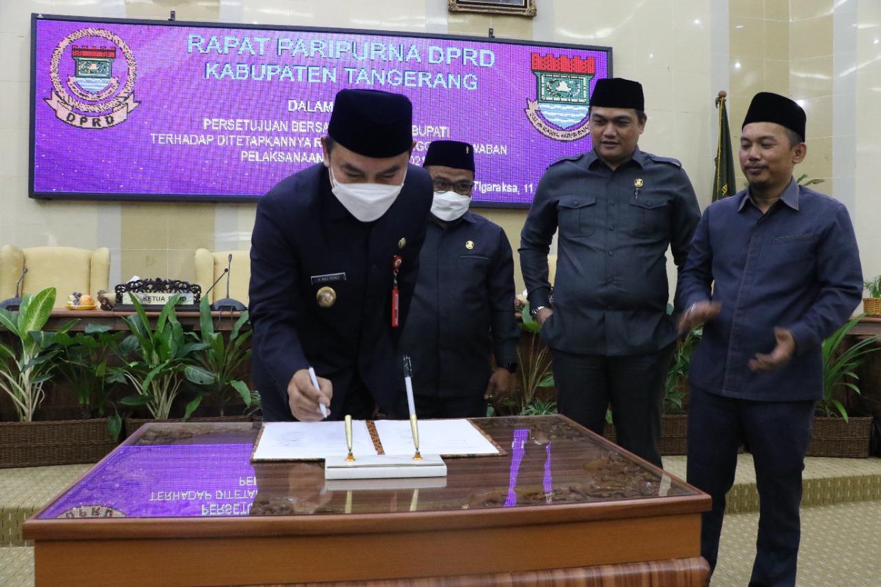 “Dengan ditandatanganinya Persetujuan bersama Raperda tentang Pertanggungjawaban Pelaksanaan APBD Tahun Anggaran 2021 menjadi Peraturan Daerah tentang Pertanggungjawaban pelaksanaan APBD Tahun Anggaran 2021 merupakan wujud apresiasi DPRD kepada Pemerintah Kabupaten Tangerang,” ungkap Kholid.