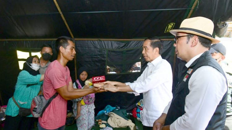 Presiden Joko Widodo meninjau langsung lokasi terdampak gempa bumi, di Kabupaten Cianjur, Provinsi Jawa Barat, pada Selasa, 22 November 2022. Dalam kesempatan tersebut, Presiden mengunjungi tenda pengungsian di Taman Prawatasari yang menjadi tempat tinggal sementara para warga yang terdampak gempa bumi.