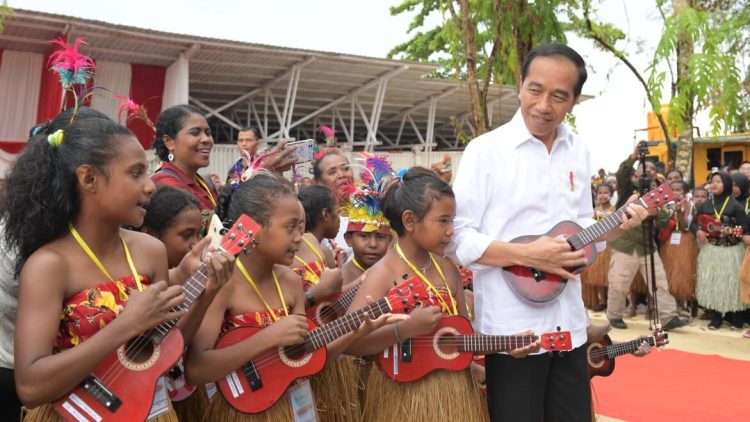 Tiba sekira pukul 08.00 WIT, Presiden Jokowi disambut oleh para pelajar yang berbaris mengenakan pakaian sali. Para pelajar tersebut pun dengan penuh semangat menari dan menyanyikan lagu “Asai Bori Yambe & Yoper” dengan iringan alat musik ukulele yang dimainkan oleh mereka.