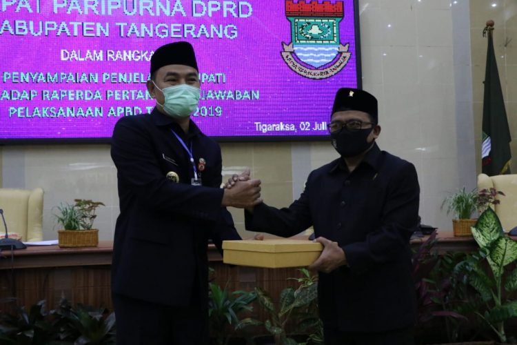 TANGERANG-Wakil Bupati Tangerang Mad Romli menyerahkan nota pengantar Laporan Keterangan Pertanggung Jawaban (LKPJ) Tahun Anggaran 2019 kepada Ketua DPRD Kabupaten Tangerang Kholid ismail pada saat rapat paripurna DPRD Kabupaten Tangerang, Kamis (2/7/2020).