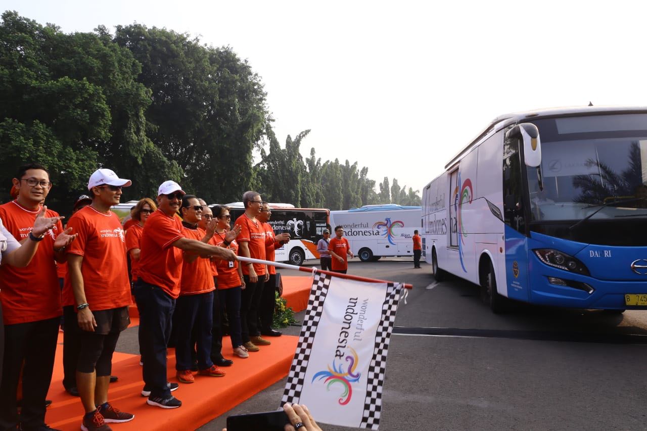 Memaksimalkan promosi pariwisata Indonesia pada event Asian Games 2018, Menteri Pariwisata (Menpar) meluncurkan bus dengan branding logo Wonderful Indonesia (WI) dan Asian Games 2018 di Lapangan Monas, Silang Merdeka Barat Daya Jakarta, Kamis (26/07) pagi.