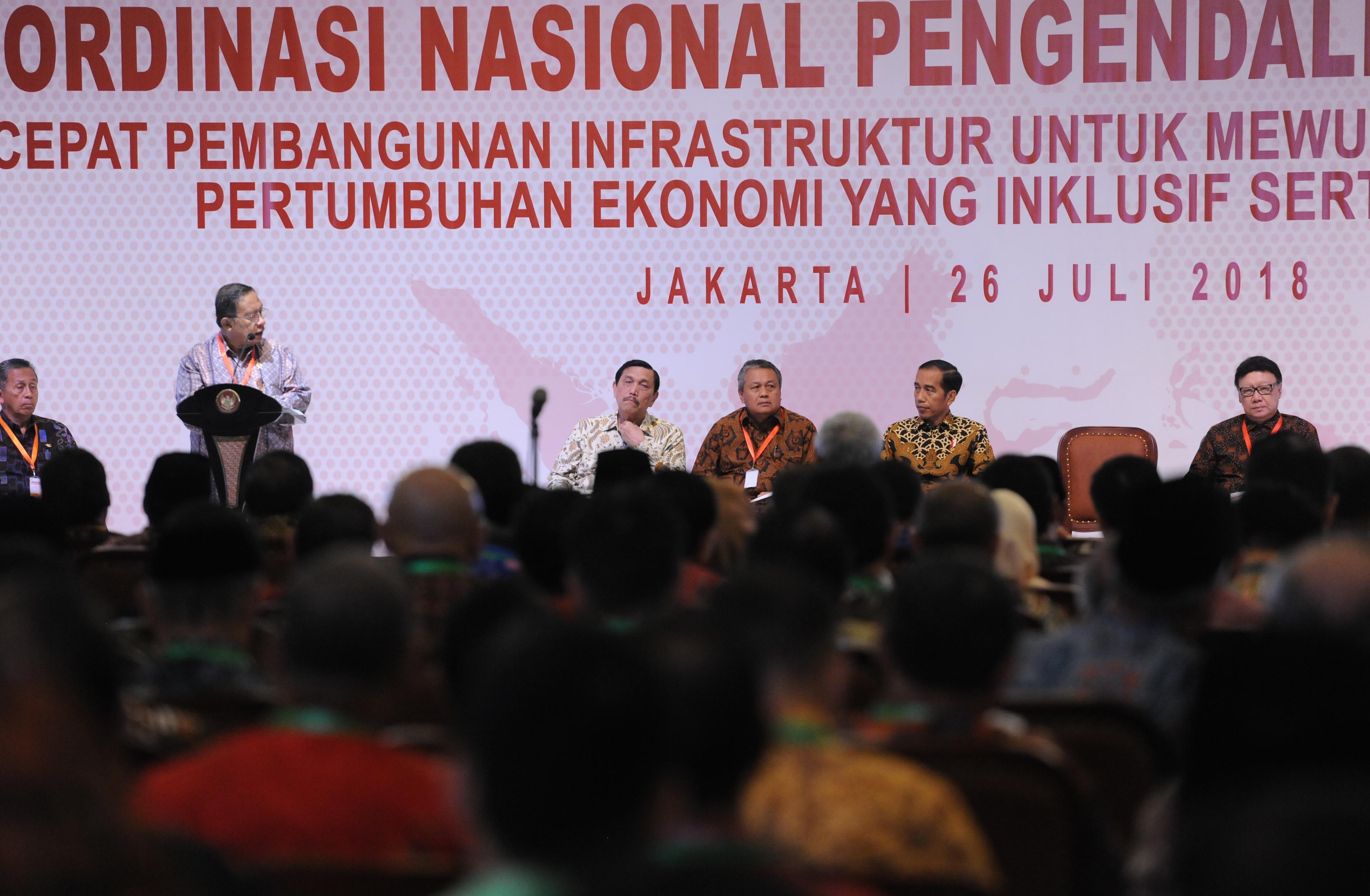 Menko Perekonomian memberikan laporan dalam Rakornas Pengendalian Inflasi Tahun 2018, di Grand Sahid Jaya, Jakarta, Kamis (26/7). (Foto: Humas/Jay).