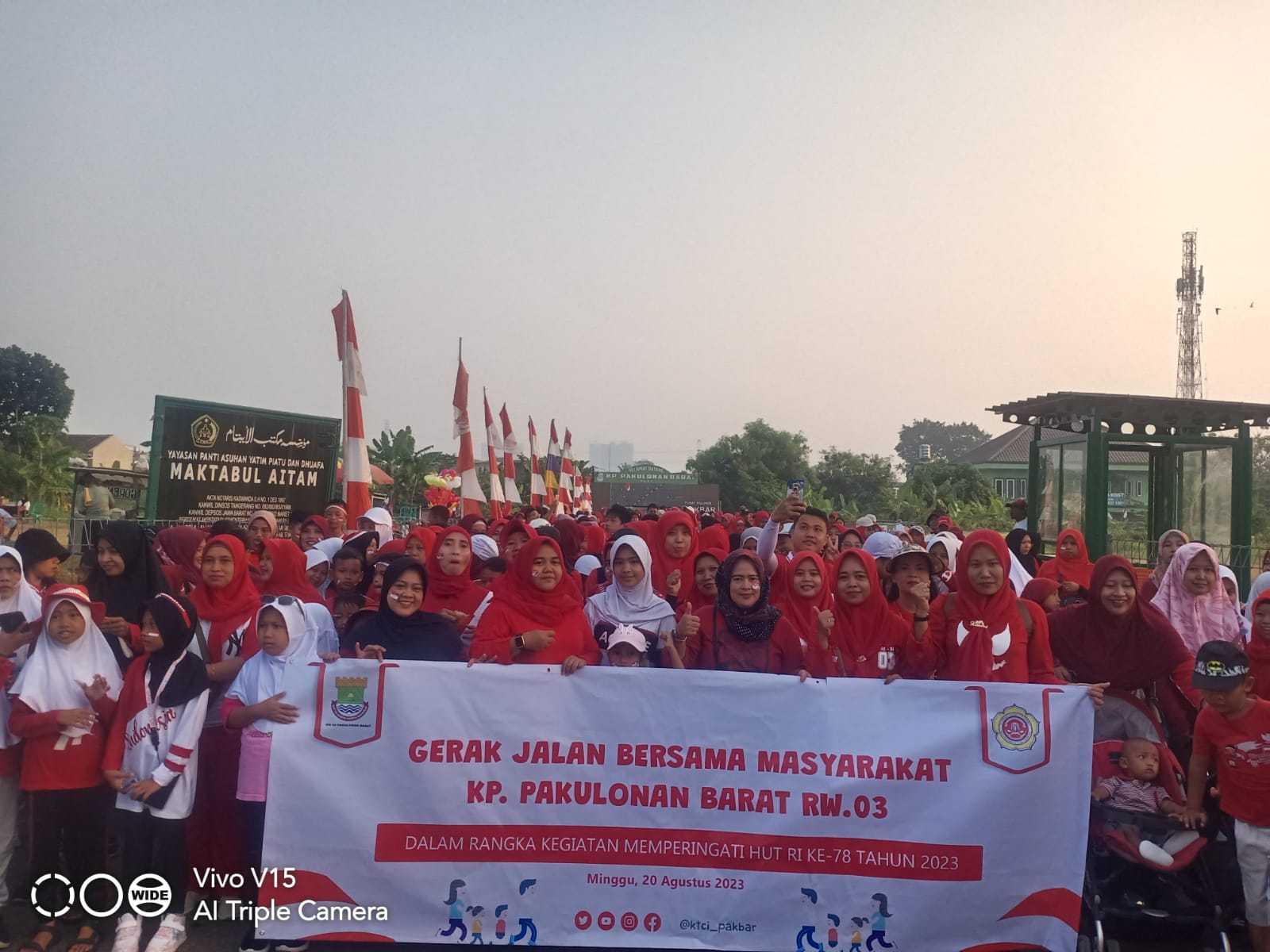 TANGERANG, WT – Ratusan warga RW 03, Kelurahan Pakulonan Barat, Kecamatan Kelapa Dua, Kabupaten Tangerang turun ke jalan mengikuti jalan santai dalam memeriahkan HUT RI ke-78 pada Minggu, (20/8/2023).