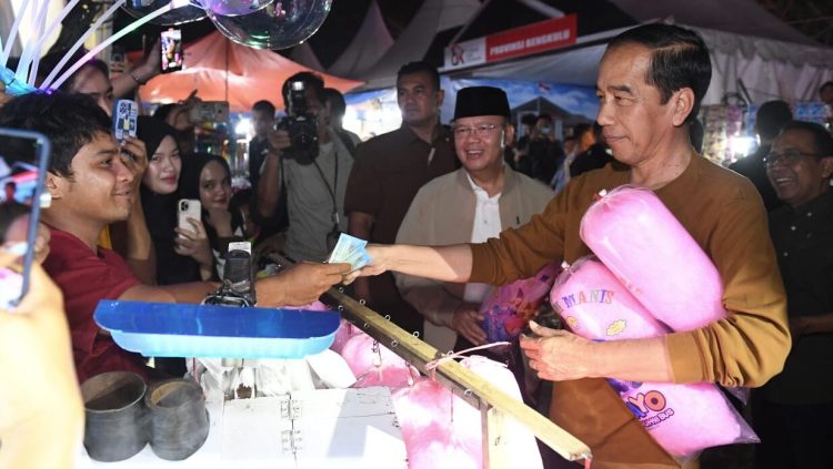 Ketika berkeliling, Presiden Jokowi tampak berhenti saat melewati penjual gulali dan membeli sebanyak lima gulali.