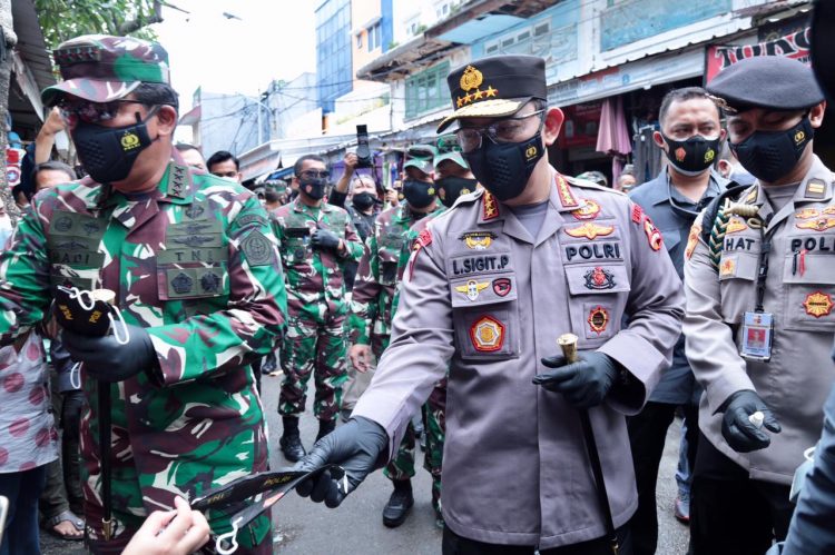 JAKARTA – Panglima TNI Marsekal Hadi Tjahjanto bersama Kapolri Jenderal Listyo Sigit Prabowo melakukan pemantauan terkait penerapan Protokol Kesehatan (Prokes) penanganan Covid-19 atau virus corona di Pasar Tanah Abang, Jakarta Pusat.