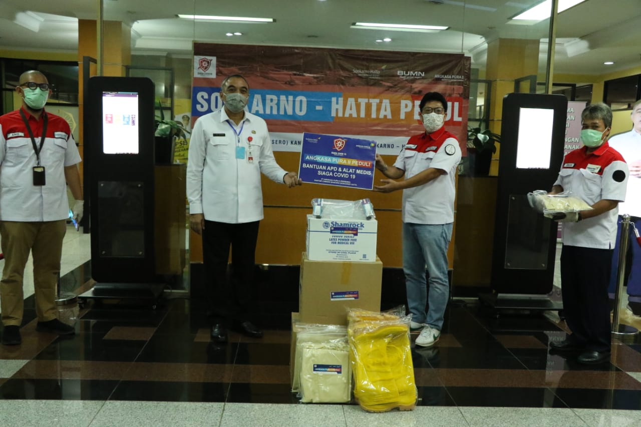 Deputy EGM Finance of Human Resources Kantor Cabang Utama Bandara Soekarno – Hatta PT Angkasa Pura II, Supriadi menyampaikan bantuan APD untuk penanganan pasien Covid-19 di Kabupaten Tangerang.