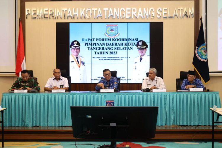 Sekretaris Daerah Kota Tangerang Selatan Bambang Noertjahjo yang memimpin rapat Forum Koordinasi Pimpinan Daerah mengenai keamanan serta ketertiban sebelum dan sesudah Idul Fitri di Ruang Blandongan, Puspemkot Tangsel, Senin, (16/4/2023).