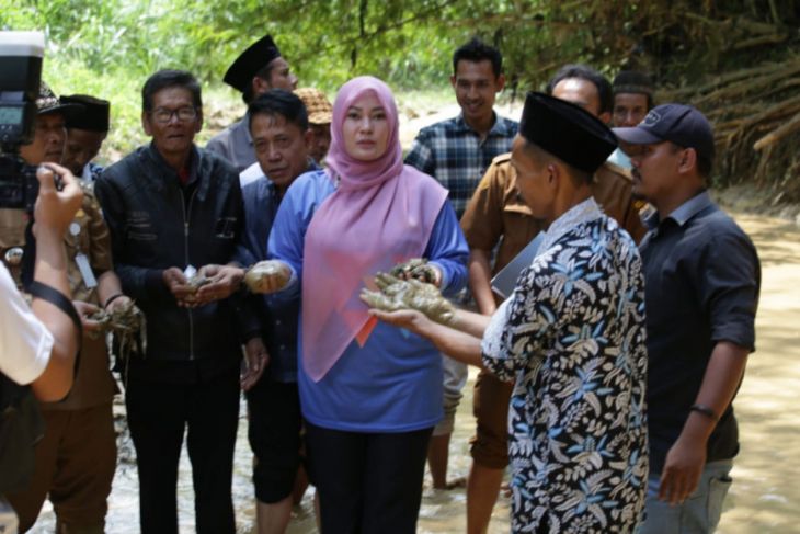 Bupati Pandeglang, Irna Narulita meninjau kondisi air Sungai Cimoyan yang kotor, diduga tercemar limbah dari galian C yang berada di hulu sungai dan masuk dalam wilayah Kabupaten Lebak
