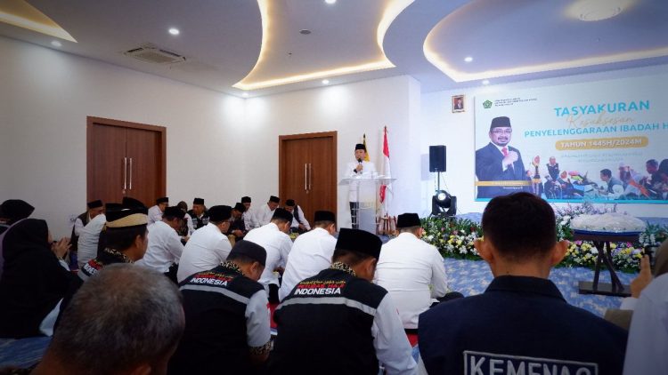 Tangerang – Kantor Wilayah Kementerian Agama Provinsi Banten menggelar Tasyakuran Kesuksesan Penyelenggaraan Ibadah Haji Tahun 1445 Hijriah/2024 Masehi di Grand El Hajj Asrama Haji Provinsi Banten, Cipondoh, Kota Tangerang, Selasa (23/7).