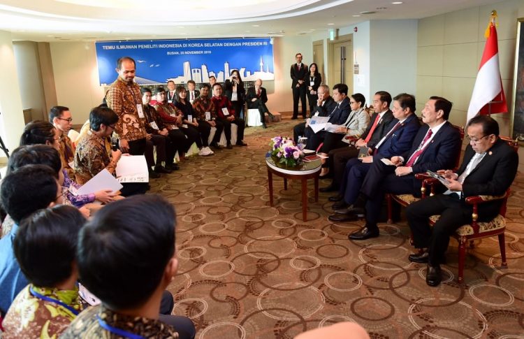 Presiden Joko Widodo pada hari ini, Senin, 25 November 2019, bertemu dengan sejumlah peneliti dan ilmuwan asal Indonesia yang berada di Korea Selatan. Dalam pertemuan yang digelar di Hotel Lotte, Busan, tersebut, Presiden Jokowi berpesan, salah satunya agar para ilmuwan tidak lupa untuk kembali dan membangun Tanah Air.