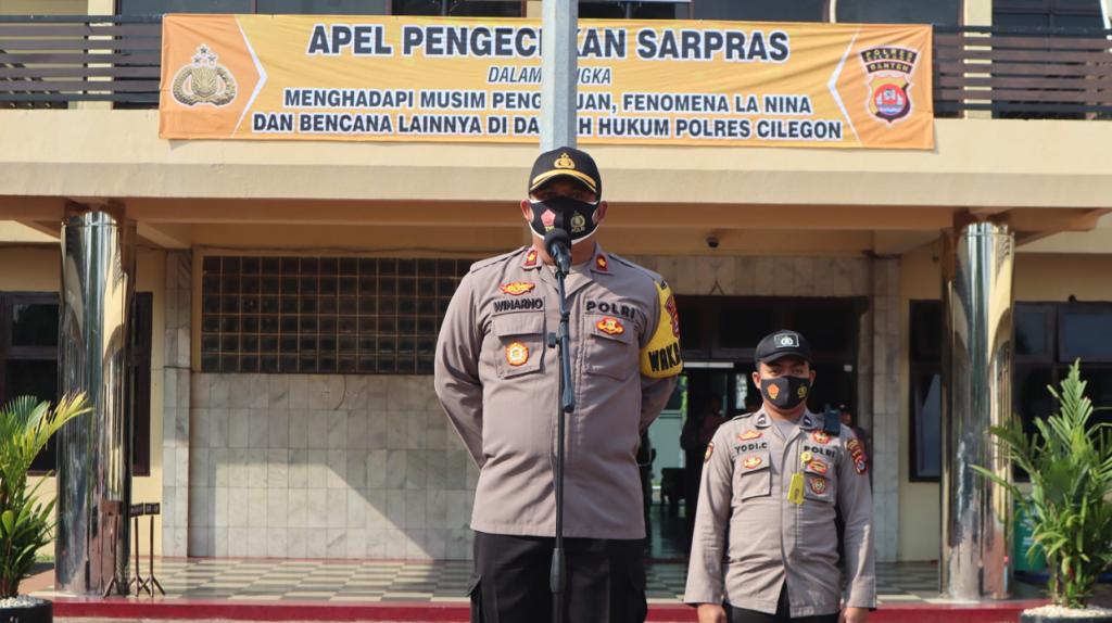 CILEGON – Polres Cilegon gelar apel pengecekan sarana dan prasarana dalam rangka menghadapi musim penghujan, fenomena La Nina dan bencana alam lainnya.