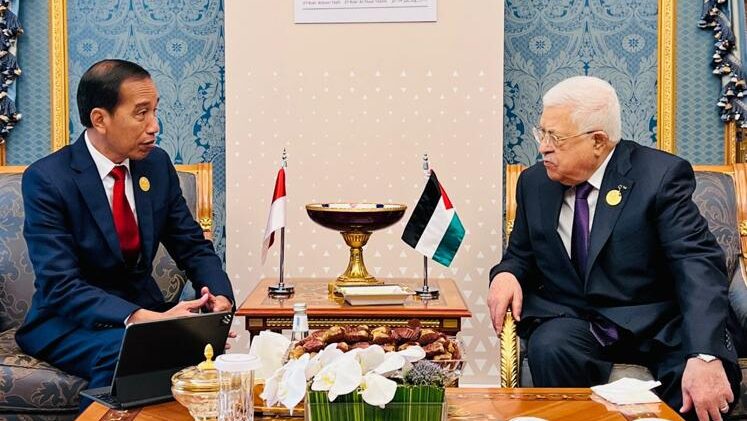 Presiden Joko Widodo bertemu dengan Presiden Palestina, Mahmoud Abbas, di sela-sela Konferensi Tingkat Tinggi (KTT) Luar Biasa Organisasi Kerja Sama Islam (OKI) yang digelar di King Abdulaziz International Convention Center (KAICC), Riyadh, Arab Saudi, pada Sabtu, 11 November 2023.