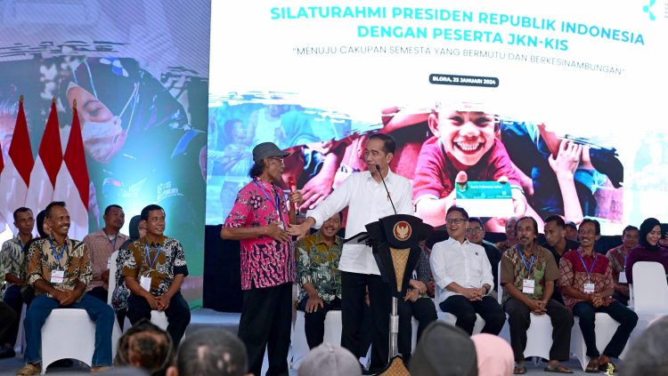 Presiden Joko Widodo didampingi Ibu Iriana Joko Widodo bersilaturahmi dengan para penerima bantuan iuran Badan Penyelenggara Jaminan Sosial (BPJS) Kesehatan pada Selasa, 23 Januari 2024. Dalam acara silaturahmi yang digelar di Graha Larasati, Kabupaten Blora, Provinsi Jawa Tengah, Presiden ingin memastikan bahwa Kartu Indonesia Sehat (KIS) atau BPJS sangat bermanfaat bagi rakyat.