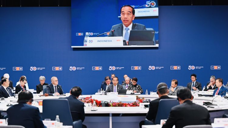 Presiden Joko Widodo menekankan pentingnya kerja sama antara ASEAN dan Australia dalam rangka memperingati 50 tahun hubungan kemitraan saat berpidato pada sesi pleno Konferensi Tingkat Tinggi (KTT) Khusus ASEAN-Australia di Melbourne Convention and Exhibition Center, Melbourne, Australia, Rabu, 6 Maret 2024. Presiden Jokowi menyebut bahwa ASEAN dan Australia berbagi tanggung jawab bersama untuk menjaga stabilitas, perdamaian, dan kemakmuran di kawasan tersebut.