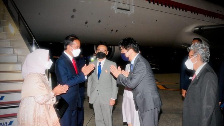 Setelah menempuh penerbangan selama tiga jam dari Beijing, Presiden Joko Widodo dan Ibu Iriana Joko Widodo beserta rombongan tiba di Bandar Udara Haneda, Tokyo, Jepang, Rabu dini hari, 27 Juli 2022.