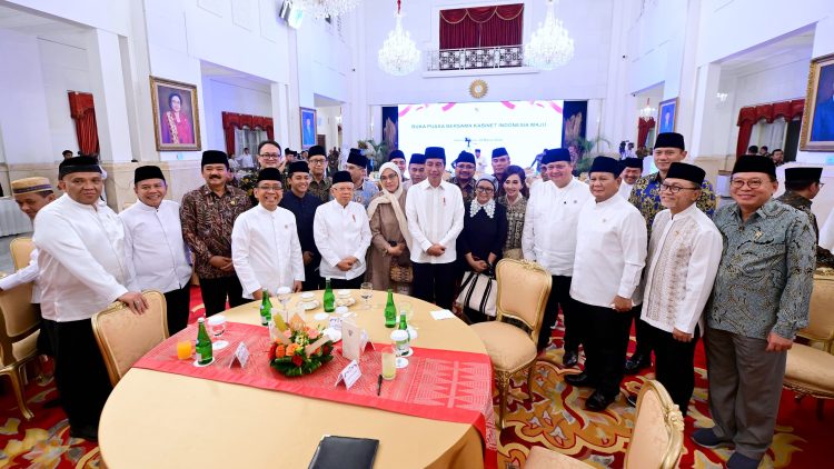 Presiden Joko Widodo bersama Wakil Presiden Ma’ruf Amin dan anggota Kabinet Indonesia Maju berbuka puasa bersama di Istana Negara, Jakarta, pada Kamis, 28 Maret 2024, bertepatan dengan 17 Ramadan 1445 Hijriah. Ini merupakan buka puasa bersama yang digelar kembali di Istana setelah terakhir digelar pada tahun 2019 lalu.