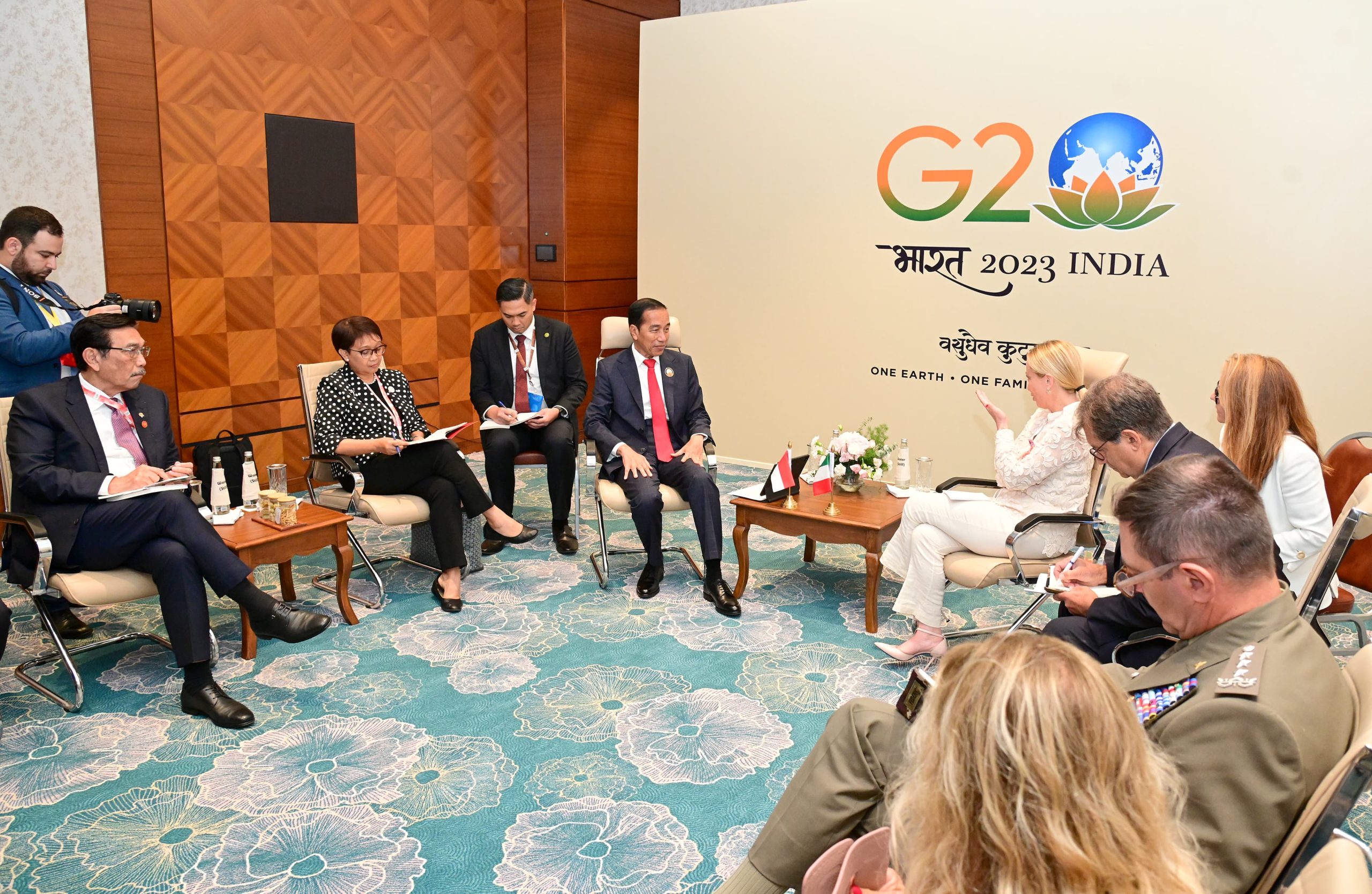Presiden Joko Widodo dan Perdana Menteri (PM) Italia Giorgia Meloni membahas sejumlah kerja sama dan investasi Italia di Indonesia dalam pertemuan bilateral antarkedua negara yang digelar di Bharat Mandapam, IECC, Pragati Maidan, New Delhi, India, pada Minggu, 10 September 2023.