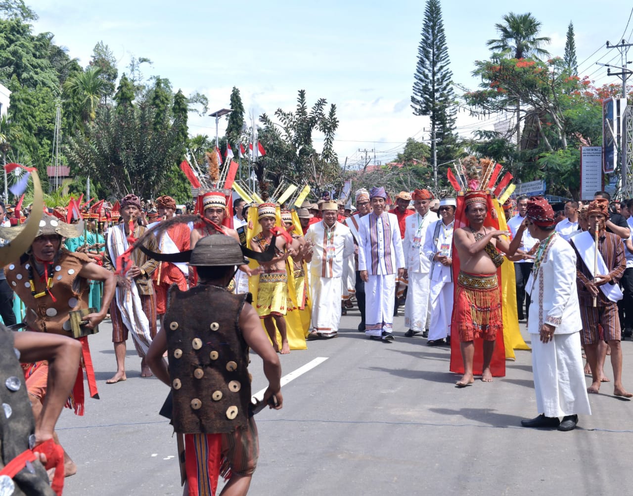 Kepala Negara yang hadir dengan mengenakan pakaian adat Tana Toraja berwarna putih lengkap dengan penutup kepala khas passapu disambut hangat masyarakat Tana Toraja yang memadati area festival.