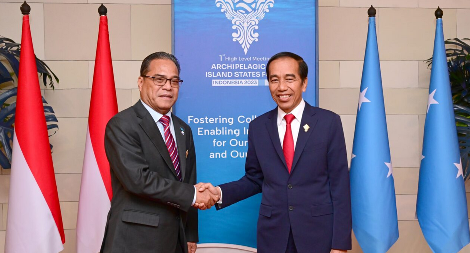 Presiden Joko Widodo menggelar pertemuan bilateral bersama Presiden Federasi Mikronesia, Wesley Simina, di Bali Nusa Dua Convention Center (BNDCC), Kabupaten Badung, Provinsi Bali, pada Rabu, 11 Oktober 2023. Sebagai sesama negara kepulauan, Presiden Jokowi menyebut Indonesia dan Mikronesia memiliki peran dan kontribusi nyata dalam menghadapi tantangan bersama.