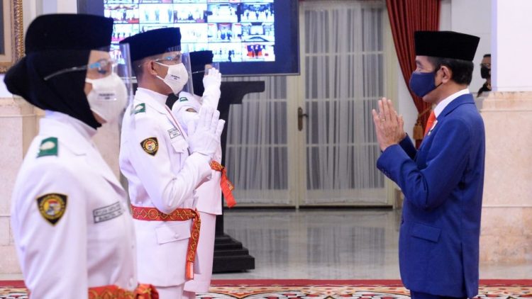 Presiden Joko Widodo mengukuhkan para pelajar SMA yang menjadi anggota Pasukan Pengibar Bendera Pusaka (Paskibraka) 2020. Pengukuhan tersebut berlangsung di Istana Negara, Jakarta, pada Kamis, 13 Agustus 2020.