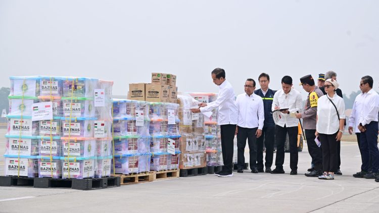 Presiden Joko Widodo melepas bantuan kemanusiaan dari Indonesia untuk Palestina di Pangkalan TNI AU Halim Perdanakusuma Jakarta, pada Sabtu, 4 November 2023. Bantuan seberat 51,5 ton yang akan dibawa dengan menggunakan tiga pesawat tersebut berisi sejumlah barang-barang logistik yang telah disesuaikan dengan kebutuhan rakyat di Gaza.