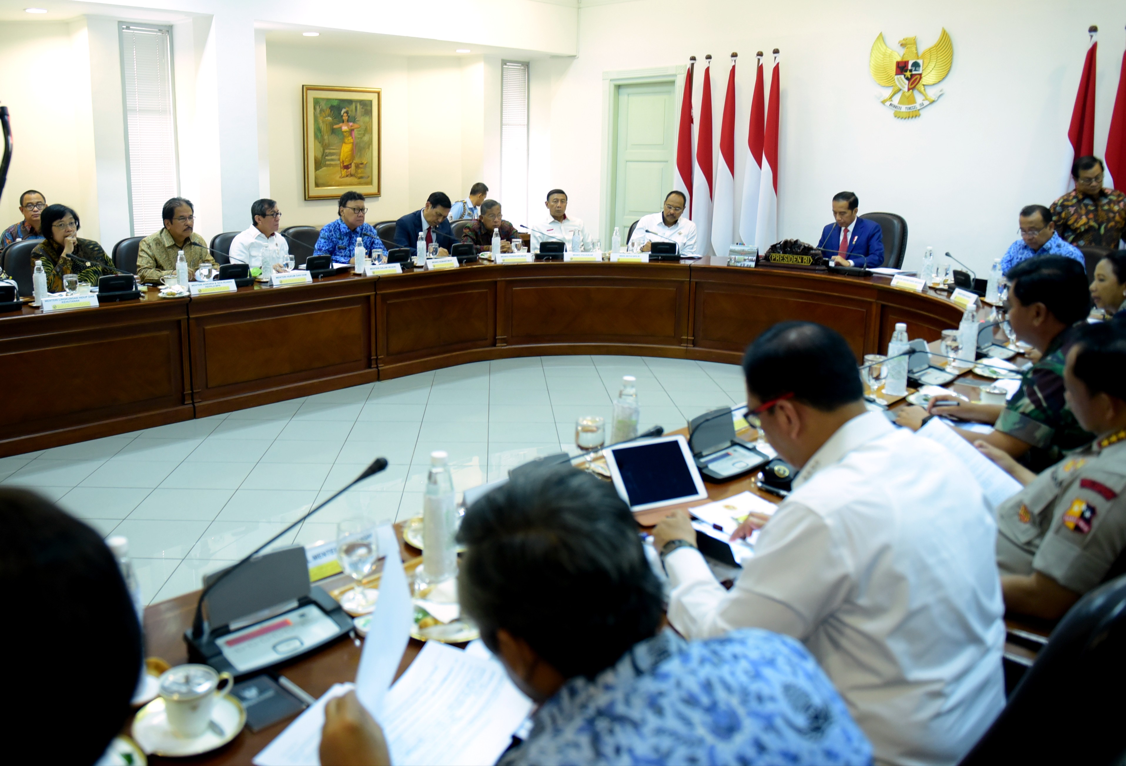 Rapat terbatas itu dihadiri oleh Menko Polhukam Wiranto, Menko Kemaritiman Luhut B. Pandjaitan, Menko Perekonomian Darmin Nasution, Mensesneg Pratikno, Seskab Pramono Anung, Kepala Staf Presiden Moeldoko, Mendagri Tjahjo Kumolo, Menkumham Yasonna Laoly, Menteri BUMN Rini Soemarno, Menteri ESDM Ignasius Jonan, Menteri ATR/Kepala BPN Sofyan Djalil, Menteri LHK Siti Nurbaya.