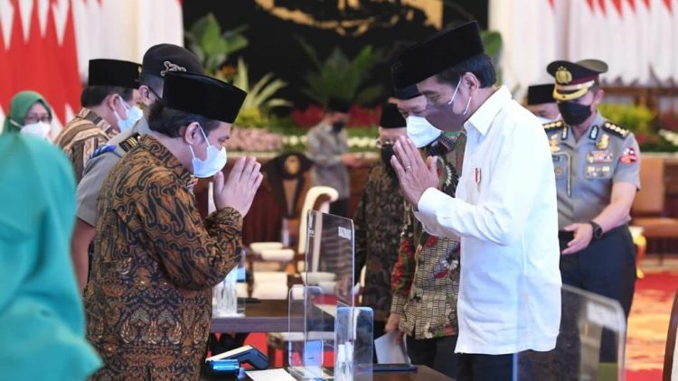 Presiden Joko Widodo menyerahkan zakat kepada Badan Amil Zakat Nasional (Baznas) di Istana Negara, Jakarta, pada Selasa, 12 April 2022. Penyerahan zakat tersebut turut diikuti oleh Wakil Presiden Ma’ruf Amin, sejumlah Menteri Kabinet Indonesia Maju, para pimpinan lembaga negara, para kepala daerah, para direktur BUMN, hingga perwakilan perusahaan swasta.