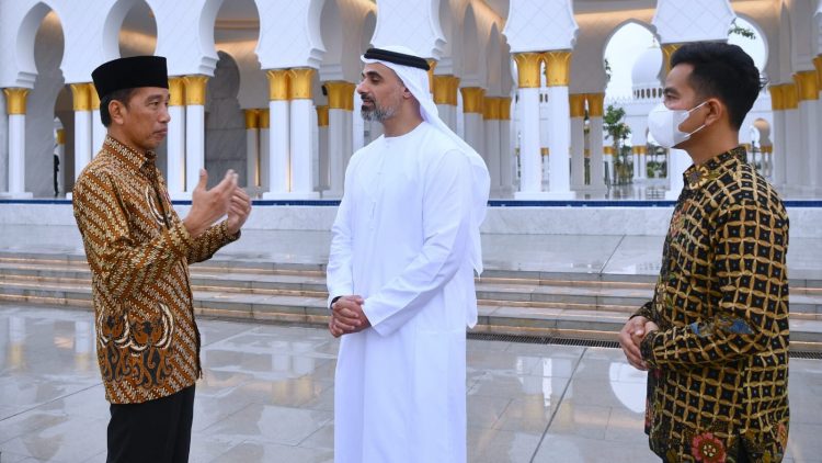 Presiden Joko Widodo menerima kedatangan Khalid bin Mohamed bin Zayed Al Nahyan, putra dari Presiden Persatuan Emirat Arab (PEA) Mohamed bin Zayed Al Nahyan (MBZ). Keduanya bertemu di Masjid Raya Sheikh Zayed, Kota Surakarta, pada Minggu, 11 Desember 2022.