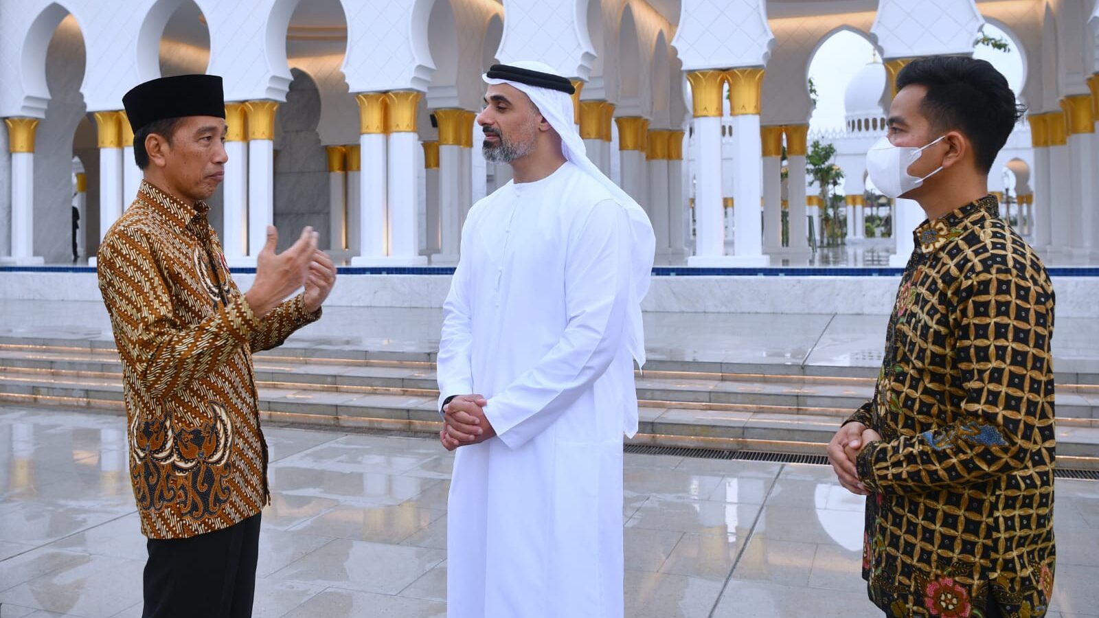 Presiden Jokowi dan Sheikh Khalid MBZ kemudian masuk ke dalam masjid dan melihat arsitektur serta desain interior masjid tersebut. Keduanya juga tampak berbincang dengan hangat dan akrab hingga pertemuan keduanya selesai.