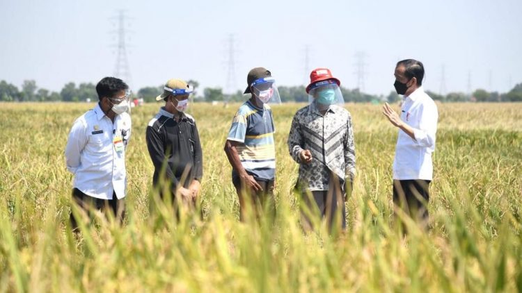 Presiden Joko Widodo meninjau aktivitas panen padi di kawasan pertanian yang berada di Desa Wanasari, Kecamatan Bangodua, Kabupaten Indramayu, Jawa Barat, pada Rabu, 21 April 2021. Dari hamparan lahan pertanian di lokasi seluas 200 hektare tersebut dapat diperoleh 7 hingga 8 ton panen padi per hektarenya dengan varietas Cilamaya Muncul.