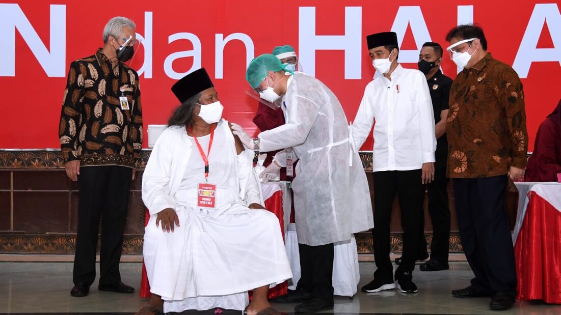 Saat kedatangan Presiden tampak para ulama dan tokoh lintas agama yang tengah menjalani giliran vaksinasi di antaranya K.H. Ahmad Muwafiq, K.H. Ubaidullah Shodaqoh, Pdt. Erinchan Naibaho, Pdt. Tjahjadi Nugroho, Anak Agung Ketut Darmaja, Bhikku Dittisampanno Thera, dan Adi Pratikto (penghayat).