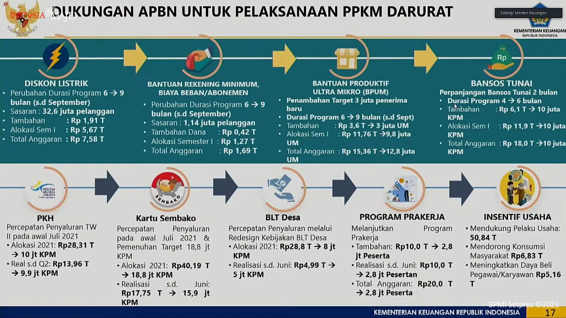 Hal tersebut disampaikan oleh Menteri Keuangan, Sri Mulyani, dalam keterangan pers secara virtual selepas sidang kabinet paripurna yang dipimpin oleh Presiden Joko Widodo pada Senin, 5 Juli 2021.