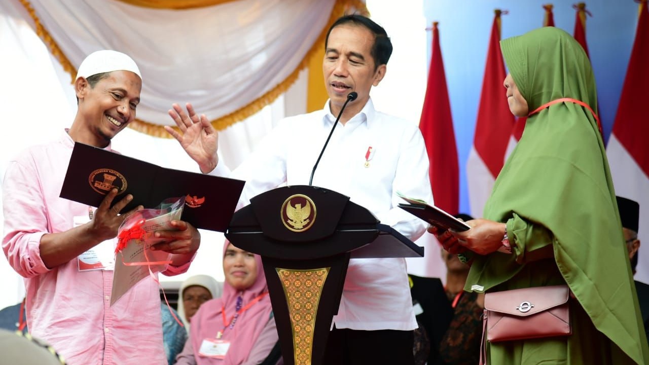 Presiden Jokowi menyerahkan 2.576 sertifikat hak atas tanah di Lapangan Futsal Galacticos Cot Gapo, Kabupaten Bireuen, Provinsi Aceh, Sabtu, 22 Februari 2020