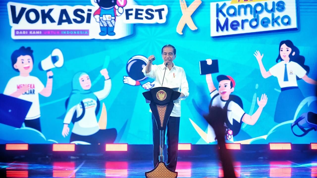 Presiden Joko Widodo memberikan sambutan usai membuka Vokasifest dan Festival Kampus Merdeka ke-3 Tahun 2023 yang digelar di Taman Ismail Marzuki, Jakarta, pada Senin, 11 Desember 2023.