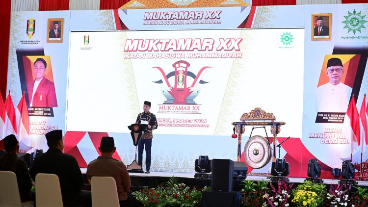 Presiden Joko Widodo membuka secara resmi Muktamar Ikatan Mahasiswa Muhammadiyah (IMM) XX Tahun 2024 di Main Dining Hall, Jakabaring Sport City, Kota Palembang, Provinsi Sumatra Selatan, Jumat malam, 1 Maret 2024. Dalam sambutannya, Presiden menekankan pentingnya hilirisasi industri dan kehati-hatian dalam mengelola ekonomi nasional di tengah tantangan global.